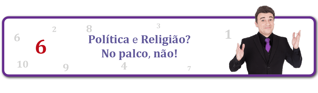 *São evitados palavras e expressões de baixo calão social, piadas com teor discriminatório e qualquer situação que possa ser interpretada como constrangedora a qualquer pessoa do público. Trata-se de humor social, absolutamente adequado a ambientes profissionais e reverentes.